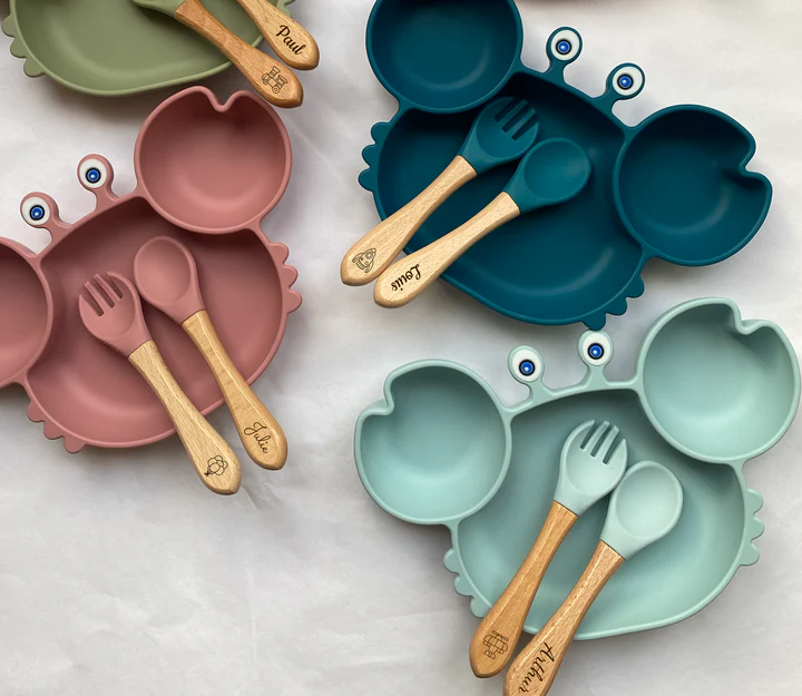 Offrez cette assiette crabe et ses couverts personnalisables. Un cadeau parfait en silicone à ventouse pour des repas de bébé en toute sérénité.