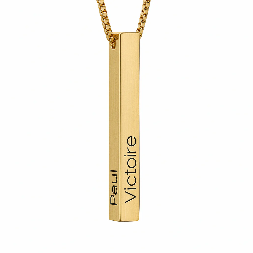 Le collier personnalisé barre 3D vous offre le luxe incroyable de pouvoir inscrire des messages sur plusieurs faces distinctes.
