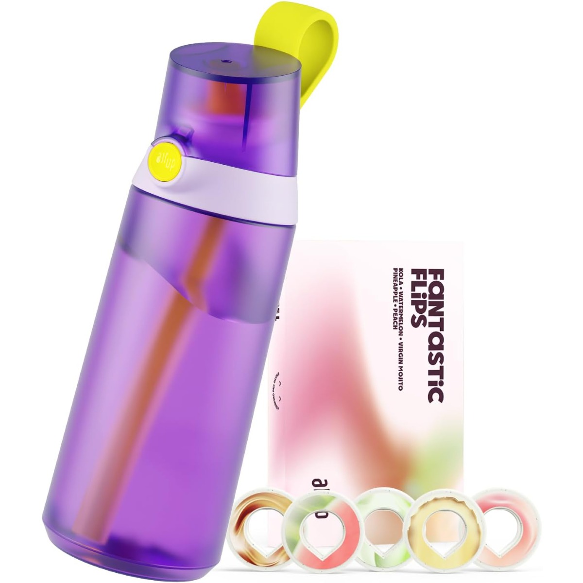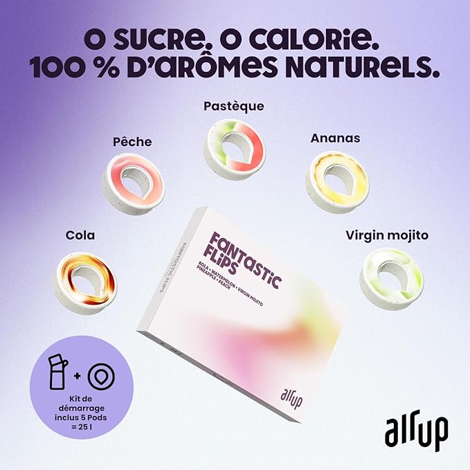 Ce pack comprend également 5 capsules de goût Fantastic Flips dans des saveurs fruitées populaires (comme cola, pastèque, mojito Virjin, pêche et ananas) qui permettent de parfumer jusqu’à 25 litres d’eau au total (environ 5 litres par capsule). Vous pouvez facilement changer d’arôme en fonction de votre humeur ou de vos envies, rendant l’hydratation plus ludique et agréable.