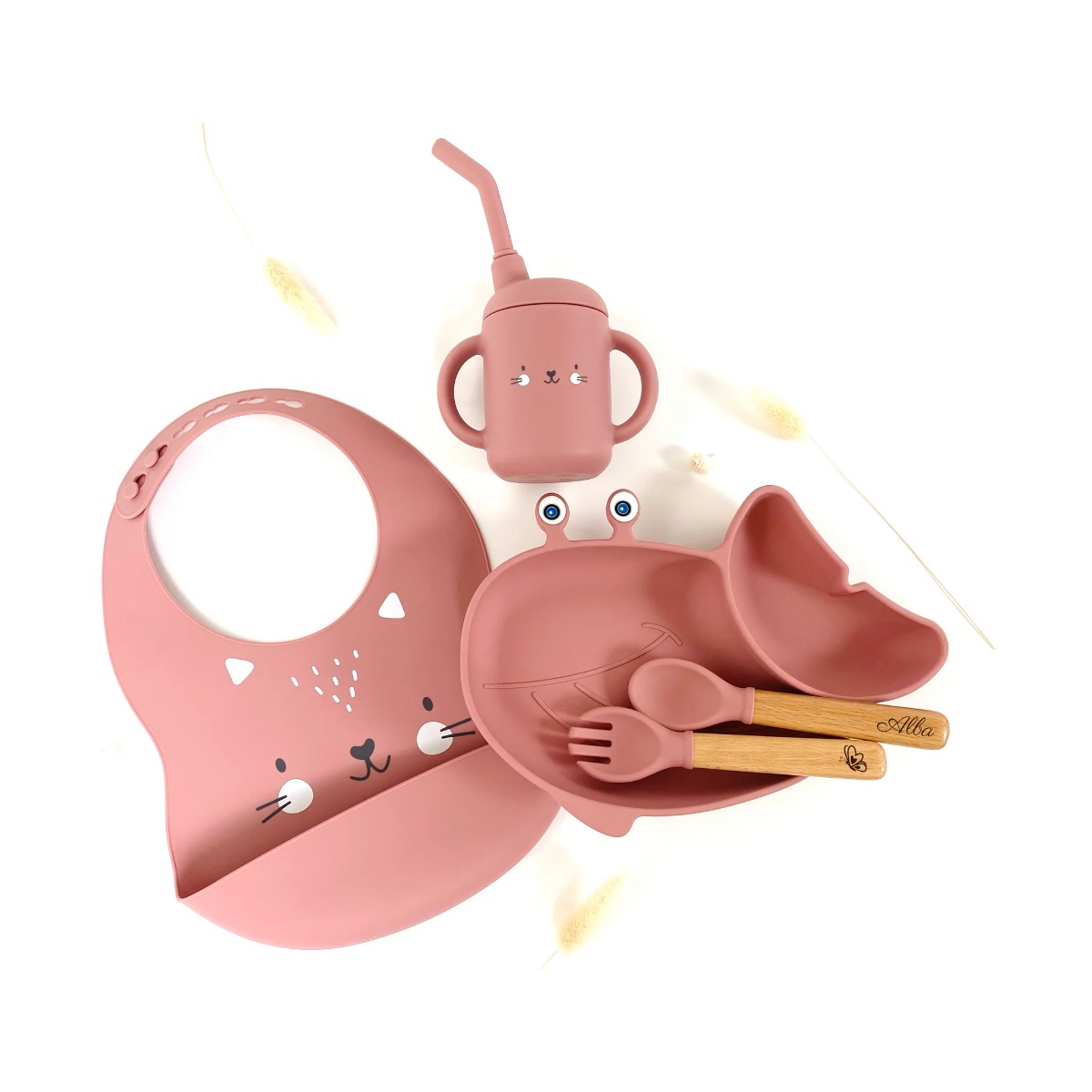 Ce bavoir dispose d’une large poche de récupération à l’avant, indispensable pour rattraper les bouchées qui échappent à la petite cuillère. Ce set de vaisselle enfant comprend également un formidable petit verre à paille conçu pour faciliter la transition entre le biberon et le gobelet.